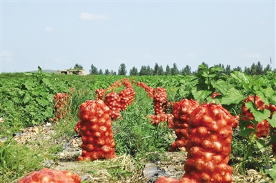 一个个装满洋葱的红色袋子成为了田野里一道独特的风景。