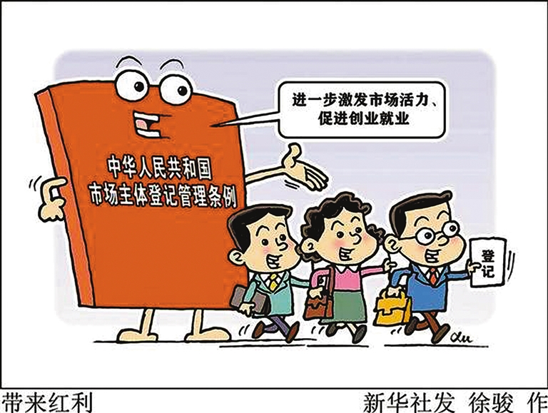日前公布的《中华人民共和国市场主体登记管理条例》(自2022年3月1日起施行),对在中国境内以营利为目的从事经营活动的各类企业、个体工商户、农民专业合作社等市场主体登记管理作出统一规定,进一步优化登记流程,压缩登记环节,精简申请材料,提升登记便利化程度,降低制度性成本,减轻企业负担。新华社发 徐俊/作