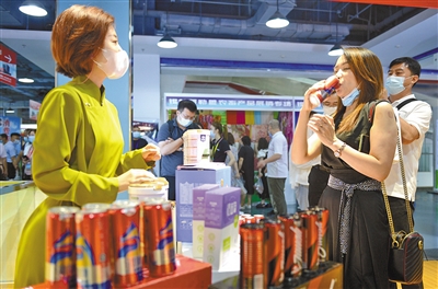 在北京消费扶贫双创中心二楼直播间,主播图雅推介着锡林郭勒奶酪,金句频出、卖力吆喝,订单接连不断。在对面的内蒙古展厅,北京市民品尝着醇香的马奶啤酒赞不绝口……
