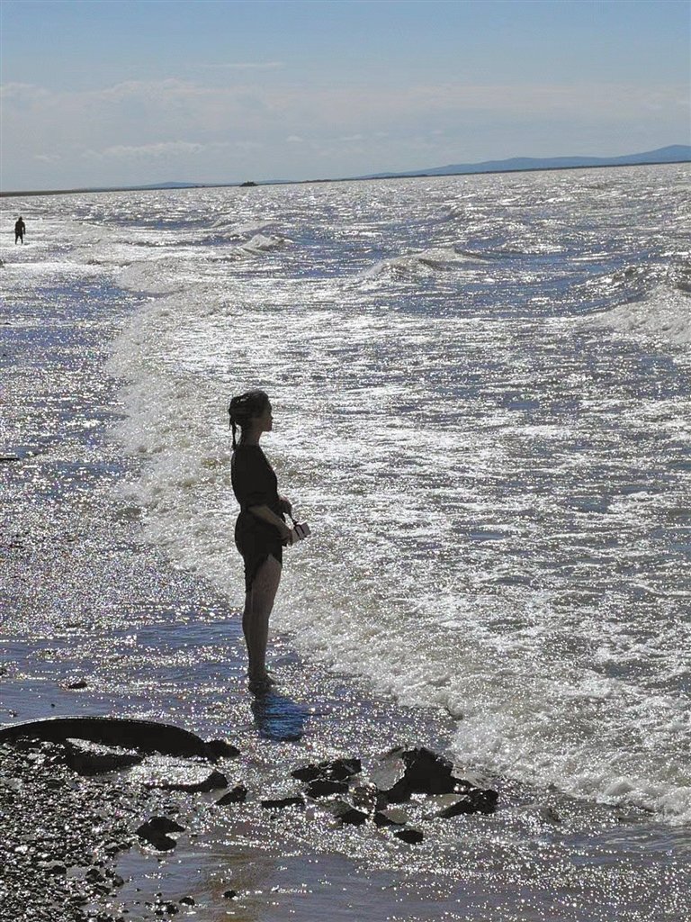 呼伦湖畔,一女子欣赏洪波翻涌、银浪滔天的壮丽景观。