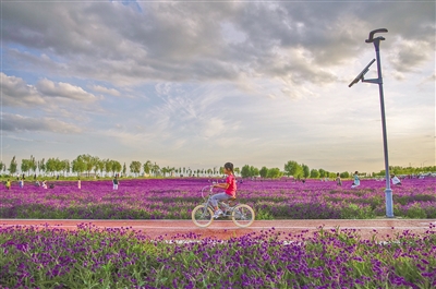 呼和浩特市大黑河北岸马鞭草花田,游人在花海中徜徉,打卡留影。