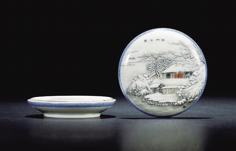 民国何许人款粉彩《程门立雪》雪景图印盒,高2.5厘米,直径8.5厘米,子母口,弧壁,矮圈足。盒盖绘《程门立雪》经典故事,以粉彩绘雾弥江天、松梅冠雪。作者巧妙地把粉彩玻璃白运用于雪景山水之中,既有传统填色的粉润效果,又有画意生动的韵味。使画面彩料浓淡自如,雪色逼真,层次有度,给人以高洁旷达、晶莹剔透、意境深邃之感。印盒正上方题有“程门立雪”4字楷书,底部落“许人出品”4字篆书款。