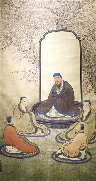 《孔子杏坛讲学图》为明代画家吴彬绘。绢本,设色,纵125厘米,横62厘米,现藏山东省曲阜市文物管理委员会。画面内容为孔子在杏坛讲学的情景。孔子居于画幅中央,4弟子分坐两旁。5人均着大领广袖长服,坐蒲团。孔子后面立一屏风,屏风后是生机盎然的杏树,杏花绽放,给严肃的讲学画面增添了几分春天的气息。