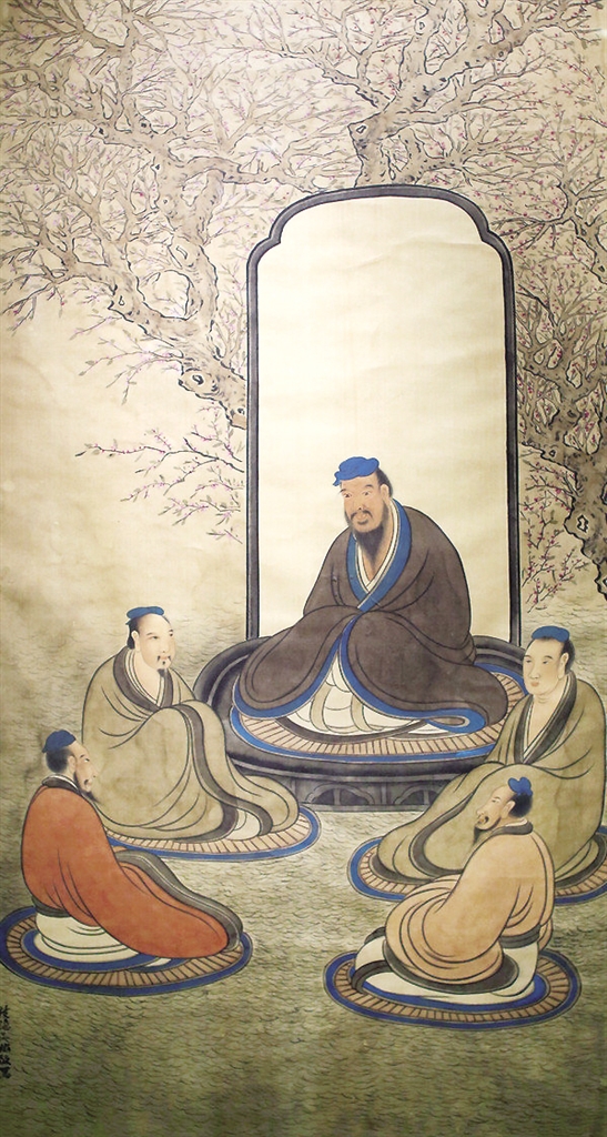 孔子是在教学实践中最早采用因材施教方法的教育家,通过谈话和个别观察等方法,了解和熟悉弟子的个性特征,在此基础上,根据各个弟子的具体情况,采取不同的教育方法,培养出德行、言语、政事、文学等多方面的人才。孔子教育弟子要有老老实实的学习态度,时常复习学过的知识,以便“温故而知新”“举一而反三”。杏坛位于曲阜孔庙大成殿前,为孔子讲学之处。他在此收弟子三千,授六艺之学,培养了一批儒学传承人。《孔子杏坛讲学图》以孔子设教讲学为题材,采用写实与浪漫手法相结合的方式,用形象生动的绘画语言,塑造了孔子学而不厌,诲人不倦的光辉形象,体现了古人尊师重教的优良传统。