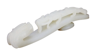 这款现藏于武汉博物馆的清代白玉“苍龙教子”带钩长12.6厘米,宽2.5厘米,厚2.5厘米,呈长方条形,浮雕、圆雕、镂雕并用。苍龙身躯宽长浑厚,略带弧形显得动感十足,身下有圆形脐;无爪无尾,头长双角,曲颈扭身,圆眼,粗眉,宽鼻;额头光滑圆润,张嘴露须,作昂首回望状,巧妙地形成龙首钩,神态安然慈祥。苍龙背上雕一无角小螭龙,应为苍龙之子,颌下无须,正拖着瘦长的身子缓步爬行于苍龙身上,口衔瑞草,目视前方,与苍龙龙头相对,似在聆听苍龙说教。虽不闻其声,但二龙神态举止生动活泼,状极亲昵。