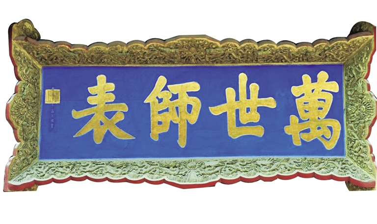 北京孔庙是元、明、清三代皇帝祭孔子的场所,正殿大成殿外,前檐高悬康熙御书“万世师表”匾。匾长449厘米,宽227厘米,磁青底,每个字一米见方,4个大金字严谨端庄、圆润丰满,气韵非凡。匾四周雕有群龙戏珠图案。
