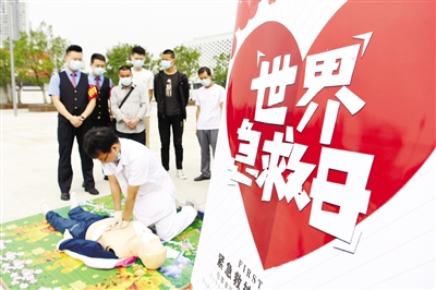 9月11日,医护人员在模拟情景中对“旅客”实施急救。当日是世界急救日,重庆铁路公安处联合重庆市红十字会医院、重庆客运段,在重庆北站南广场开展应急救护宣传活动,为过往旅客和铁路职工传授讲解应急救护相关知识。
