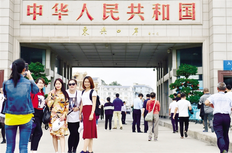 游客在东兴口岸的国门前合影拍照(2019年3月21日摄)。1991年,中国应邀出席在吉隆坡举行的第24届东盟外长会,正式和东盟建立对话关系。30年来,双方不断拓展在互联互通、经济融合、经贸合作、人文交往等各领域合作的深度与广度,合作成果硕果累累。双边贸易额从不足80亿美元跃升到超过6800亿美元,贸易规模扩大了85倍。2020年,双方实现互为第一大贸易伙伴的历史性突破,中国-东盟关系已成为亚太区域合作中最为成功和最具活力的典范。