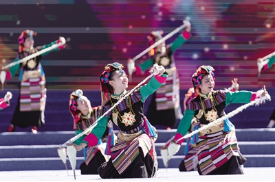 9月13日,演员在2021雅砻文化旅游节开幕式上表演舞蹈《织梦》。当日,2021雅砻文化旅游节在西藏自治区山南市开幕。今年的雅砻文化旅游节以“建设美丽新山南,圆梦幸福新时代”为主题,活动时间为9月13日至9月16日,旨在进一步促进各民族交往交流交融,吸引更多人走进山南、了解山南。 新华社记者 孙瑞博 摄