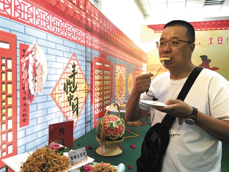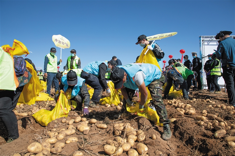 活动现场,彩旗招展、土豆成堆,处处蕴含着浓郁的丰收元素。会场展区,黄澄澄的土豆堆成“小山”,硕大的“丰”字格外耀眼;舞台上,小合唱、歌伴舞、群舞,欢庆的节目精彩纷呈;种植区,拣土豆、称土豆、装土豆,土豆趣味运动会速度又刺激。