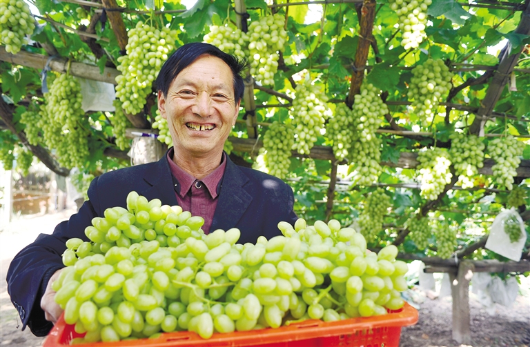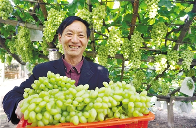 9月21日,在河北省张家口市宣化区观后村,村民展示采收的葡萄。中秋佳节到,又是一年丰收时,我国广大农村地区开展形式多样的庆中秋活动,品民俗、赏美景、观歌舞、采鲜果、度佳节,美丽乡村处处洋溢着喜庆丰收的欢乐吉祥气氛。新华社发