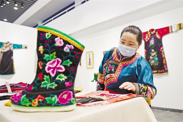 9月23日,呼和浩特市民在观看刺绣作品。当日,“绣美新时代”——内蒙古刺绣礼物大赛作品展在内蒙古展览馆开展,展览分为“传承·日用”“匠心·工艺”“融合·创新”“记忆·珍藏”四个部分,共展出390件刺绣作品。