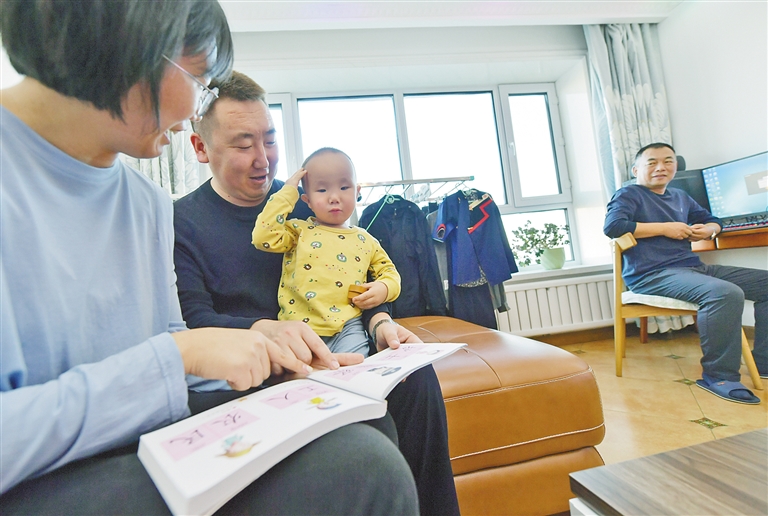 “国,中国的国,我们都是中国人……”距巴彦社区不远的图布新社区,孟和与妻子邵慧正在教2岁的儿子阿木尔识字。邵慧说:“我俩都是基层民警,日常工作就是帮助群众解决各种问题,我们这里多民族聚居,工作中我们会多一些耐心、多一些贴心,让群众满意,就是我们努力的方向。”双方父母为了让小两口放心工作,承担起了照顾孩子的责任。孟和说:“我父亲是鄂温克族,母亲是达斡尔族,岳父是汉族,岳母是蒙古族,一家人互相关心,从民族习俗到生活习惯,都彼此尊重,经常一起喝奶茶、听音乐,其乐融融!”