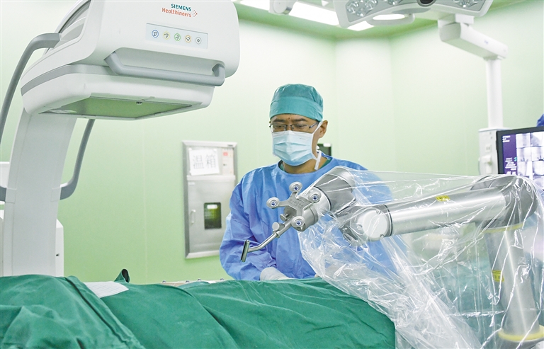 在北京市海淀医院手术室,骨科手术机器人的机械臂在定位穿刺位置。近日,2021世界机器人大会在北京召开,世界机器人博览会也同期举行。其中,手术机器人受到了人们的关注。新华社发