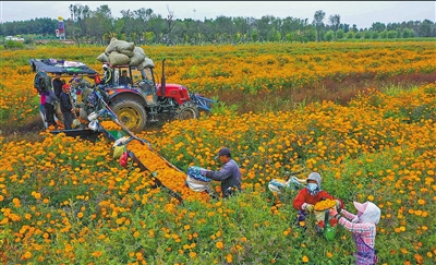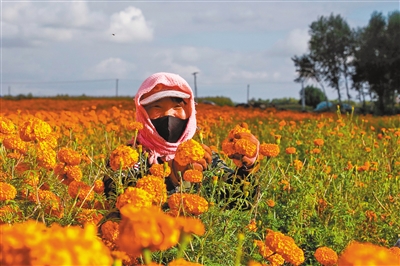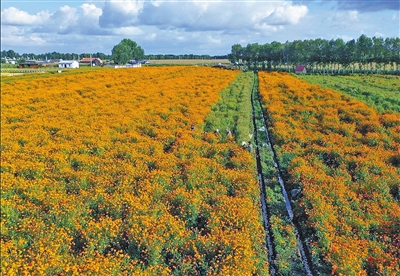 金秋时节,兴安盟扎赉特旗田地里一派丰收景象。在多彩的田地间,橘色万寿菊成为一片亮丽的风景。