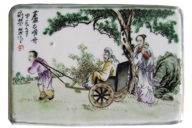 百善孝为先,从古到今,我国尊老敬老的故事不胜枚举。笔者收藏的这件民国粉彩“芦衣顺母”脉枕,长11.6厘米,宽8.3厘米,高4.5厘米,为民国制瓷名家刘荣盛的作品。