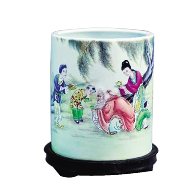 笔筒高14厘米,直径12.2厘米,胎质细腻,色彩艳丽。筒体上,工笔绘就一幅敬老图:一红衣老者端坐树下歇息,花衣顽童从远处奔跑而来,手持一把绿色执壶为老人斟酒。左右两位年轻女子一人捧着糕点,一人端着茶壶随时准备上前侍奉老人。整幅瓷画构图精巧,洋溢着浓郁的生活气息。