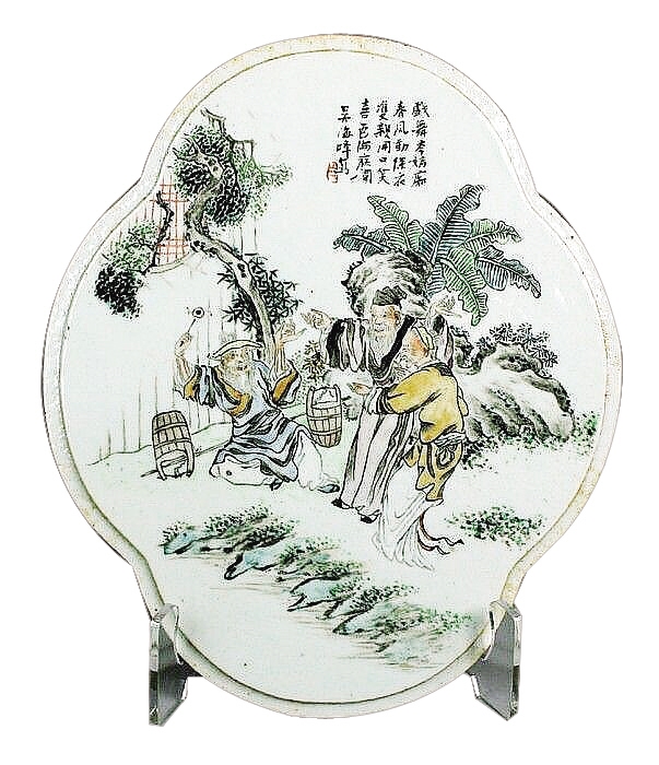 海棠形瓷板,高25.3厘米,宽21.5厘米,四面圆弧造型,瓷板绘图讲的是《老莱娱亲》的故事。绿树葱茏,小草茵茵,七十多岁的老莱子坐在地上,右手摇着拨浪鼓,左手比划着。他身后是水桶和扁担,一只水桶立着,一只水桶倾斜着。站立一旁的父母面若灿菊,伸出手臂示意老莱子快点起来。瓷板上端有“戏舞学骄痴,春风动彩衣;双亲开口笑,喜气满庭帏。”诗句和“吴海峰画”落款及红色钤印。吴海峰是清末民国时期瓷器彩绘艺人,擅画人物,多见浅绛彩作品,字画俱佳。