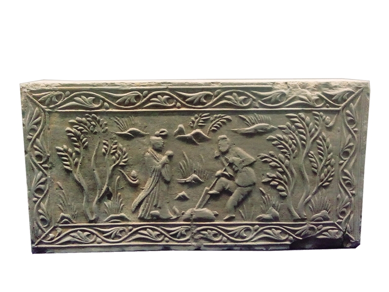 画像砖是古代一种特殊的建筑和装饰材料,集雕刻、绘画、烧造技艺于一体。此画像砖器形完整,浅浮雕手法精熟,图案精美,色彩雅致,凹凸感强烈。工匠以树木、山石、草丛等自然景物烘托主体画面,通过对人物形象栩栩如生的刻画,将郭巨孝敬母亲的故事进行了很好的描述。
