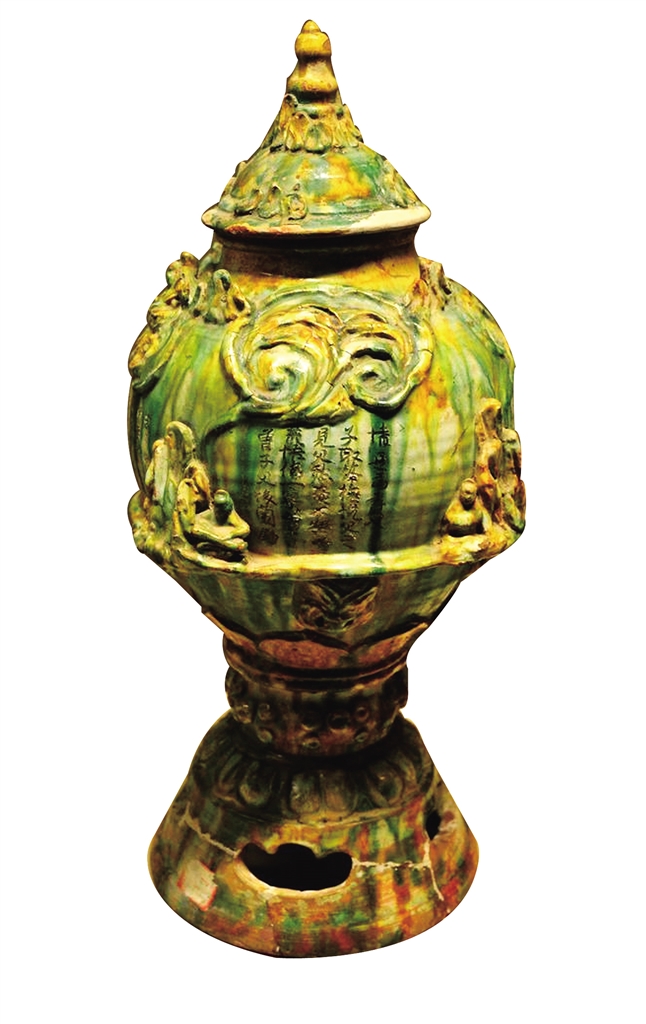 三彩四孝塔式罐是唐三彩中的孤品,具有很高的艺术价值,不仅标志着耀州窑唐三彩烧制的高度发达,而且对于研究佛教的中国化过程也有很高的学术价值。