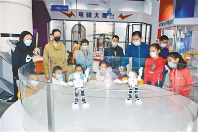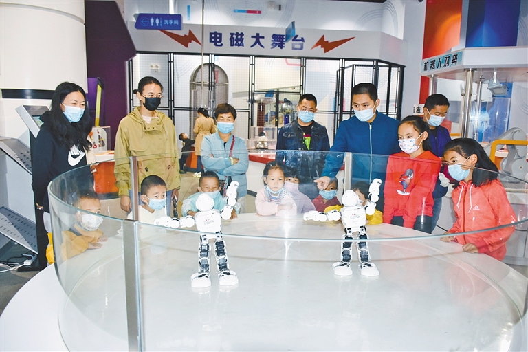 家长和小朋友们正在感受科学乐趣。近日,阿拉善盟科技馆开展了“造纸术”“湿拓画”等趣味手工课以及“画脸谱 识国粹”“DIY国旗升降台”等科普活动,为市民奉上科普大餐。郑嘉和 摄