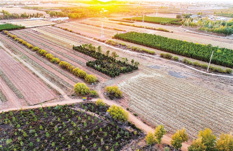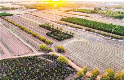 10月25日拍摄的鄂尔多斯市伊金霍洛旗红庆河镇田园景色(无人机照片)。深秋时节,在伊金霍洛旗红庆河镇,田园呈现出斑斓的色块,构成一幅幅美丽图画。王正 摄