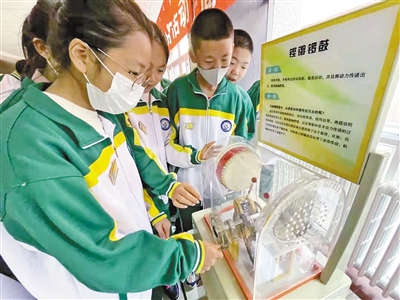 学生们参观科普展品。近日,通辽市科尔沁区科学技术协会举办科普大篷车进校园志愿服务活动。活动设置展示、体验、互动等多个环节,为师生们带去趣味十足的科普大餐。 张庆学 摄