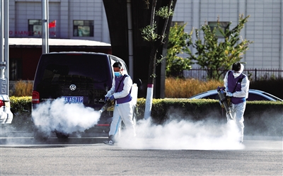 10月27日,呼和浩特蓝哈达爱心公益的志愿者正在进行区域消杀。据了解,为做好公共区域消杀防疫工作,有效阻断病毒传播,蓝哈达爱心公益的志愿者自筹资金购进烟雾机、消毒液、防护服等消杀设备和物资,在全市范围内开展公益消杀服务。从10月25日起,已对呼和浩特市多个核酸检测点、小区、学校进行全面消杀,为疫情防控贡献力量。本报记者 孟和朝鲁 王鹏 摄
