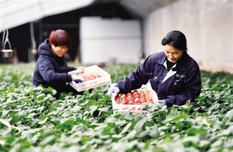 12月8日,工作人员正在摘草莓。呼和浩特市海拔高,昼夜温差大,气候冷凉,病虫害少,具有得天独厚的发展草莓产业的优势条件,草莓品质明显优于外地。内蒙古百鲜农业有限公司在新城区讨思浩村建立草莓商品果示范种植基地,吸纳讨思浩、古路板等周边村庄300余人就业,通过草莓种植带领村民增收致富。