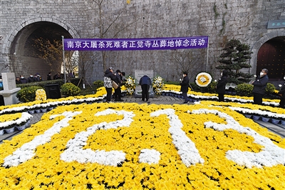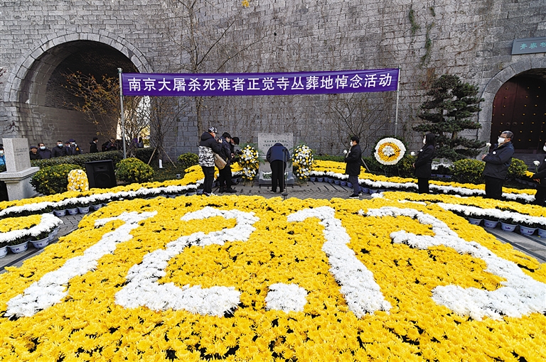 12月13日,在侵华日军南京大屠杀死难同胞丛葬地(正觉寺),人们在遇难同胞纪念碑前悼念。当日是第八个南京大屠杀死难者国家公祭日。南京市民通过默哀、献花等多种形式悼念遇难同胞。 新华社发