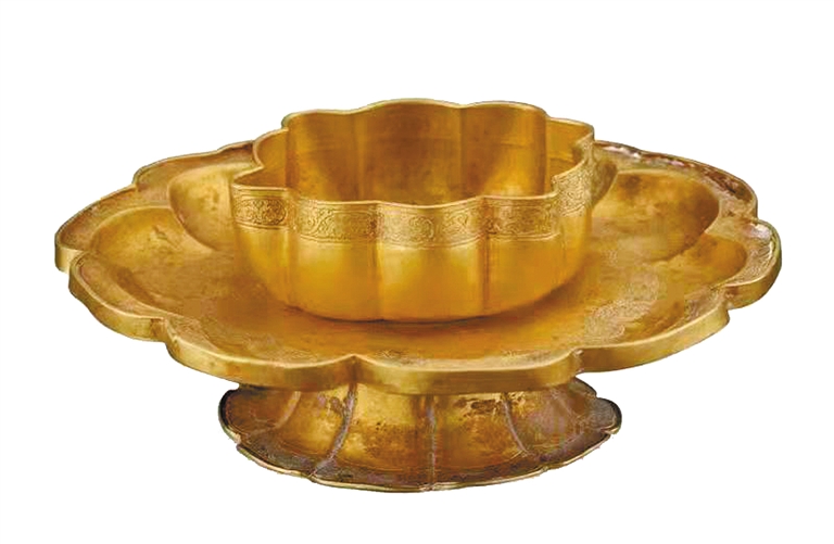 莲花形金盏托的托盘高4.5厘米、直径12厘米;碗盏高3.5厘米、口径10.6厘米,通体呈莲花状,托盘、碗托外缘均錾刻缠枝花草纹,做工精致,造型美观,出土于巴彦淖尔市临河区高油坊西夏古城遗址。