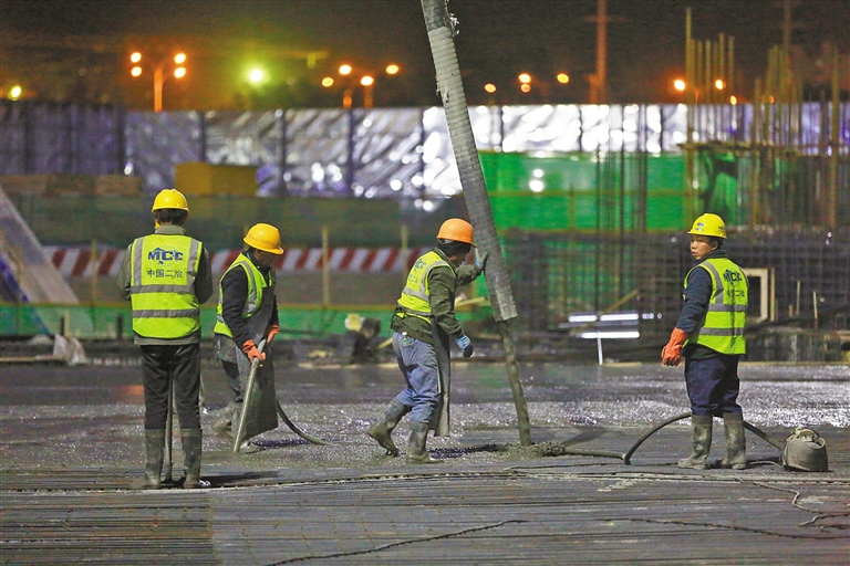 12月12日,中国二冶中冶德贤公馆项目工地上灯火通明,工人正在抓紧施工。为进一步加快工程建设进度,中国二冶中冶德贤公馆项目全体参建人员紧抓施工“黄金期”,日夜坚守工作岗位,奋战在施工一线,确保工期目标顺利完成。本报记者 孟和朝鲁 摄