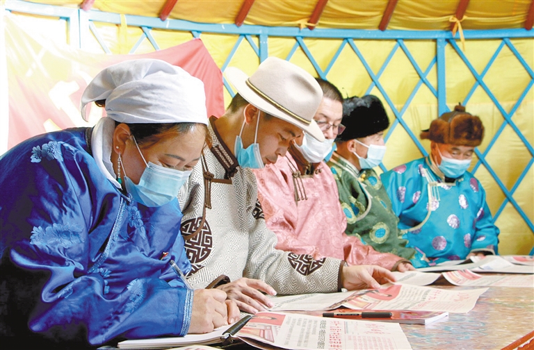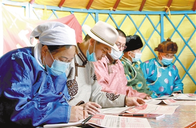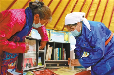 不一会儿,照日格巴特尔便来到朝鲁门图雅家,他取上装满书籍的“努德勒”书箱,向牧民党员乌仁其其格家驶去。乌仁其其格是一位有着近30年党龄的老党员,挑选到自己心仪书籍的她高兴地说:“‘努德勒’书箱里有党史学习资料、畜牧业应用知识、以及历史文学方面的书籍,为我们提供了非常方便的阅读和学习条件。”