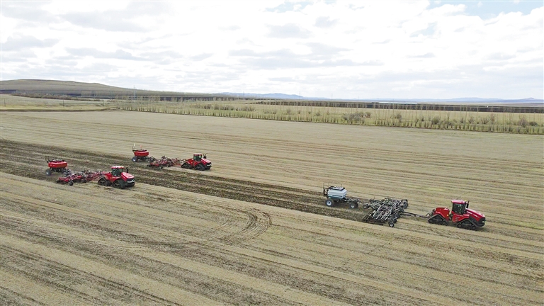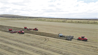 一台台大型机械在田间来回穿梭,伴着机器轰鸣声,作物秸秆被粉碎、抛洒,这是秸秆还田的重要步骤,也是呼伦贝尔农垦苏沁农牧场公司进行黑土地保护性耕作的重要措施。