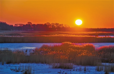 扎赉特旗绰尔河畔,朝阳初起,红霞满天,树影绰绰,芦花欲燃,美不胜收。文/图 王丽华