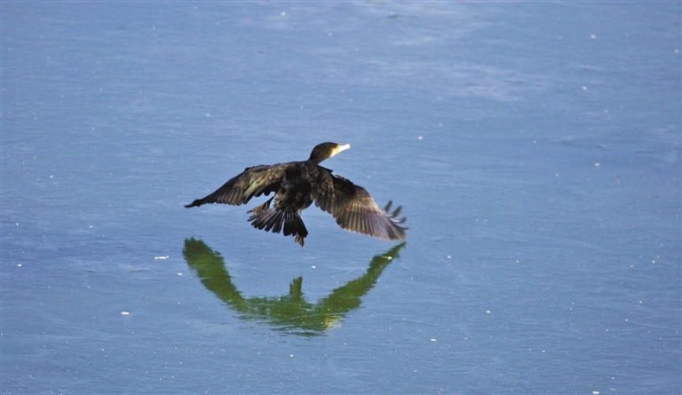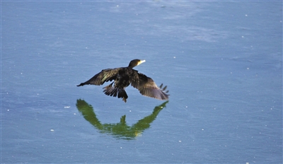 呼和浩特市南郊,一只鸬鹚在大黑河上寻找未封冻的河面。文/图 康毅