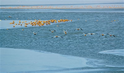 土左旗北海流水库,赤麻鸭在即将封冻的水面觅食。