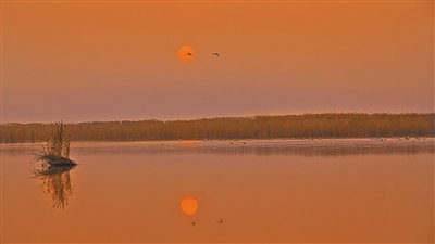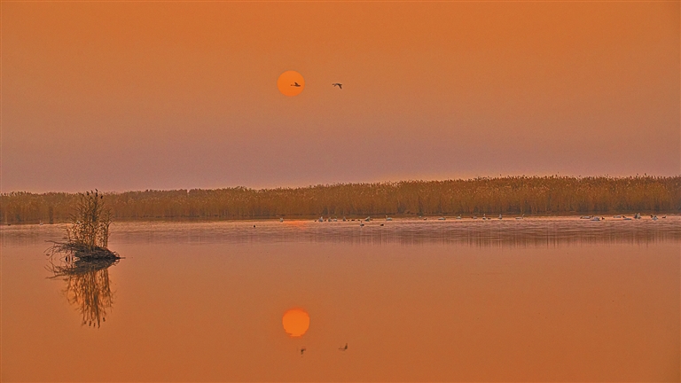 乌梁素海,红日西斜,双鹄齐飞,湖平如镜,芦花不摆,群鸟嬉水,静美如画。文/图 寇新换