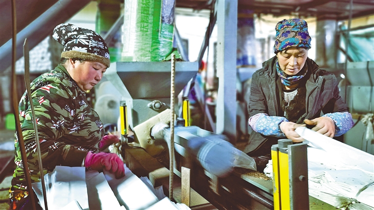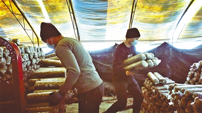 在菌棒加工生产车间内,机器声隆隆,每台装袋机前有4名工人,有的负责套袋,有的负责扎口,大家配合默契,紧张有序。配料、拌料、装袋、消毒灭菌等生产过程均实现了机械化、标准化,不仅提高了效率,也降低了生产成本。