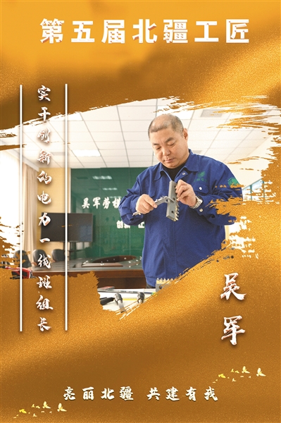 吴军,现任国网蒙东电力科左后旗供电分公司一线班长,高级技师,高级工程师,获得自治区金牌工人、科尔沁工匠、自治区技术能手、自治区草原英才、自治区劳动模范、自治区技师高级技师突出贡献奖、自治区突出贡献专家等荣誉。吴军被业内人称为“电诸葛”,是一个勇于担当、精于管理、善于协调、敢于创新的电力生产一线班组长,带领他的班组成员风里来雨里去,奔波在辖区的角角落落,“用心工作、真情服务”,严格履行岗位职责,积极满足群众需求。自2011年成立了吴军劳模创新工作室至今,研发成果取得国家实用新型专利9项。工作室被命名为自治区级职工创新工作室、国家电网公司劳模创新工作室示范点。