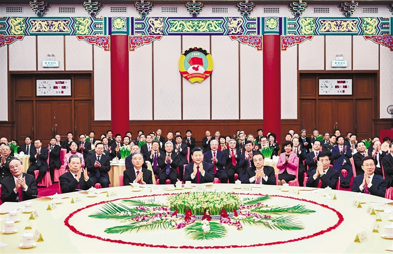 全国工商联主席高云龙代表各民主党派中央、全国工商联和无党派人士讲话,表示将更加紧密地团结在以习近平同志为核心的中共中央周围,协力新时代,携手新征程,共促新发展,为人民过上更加幸福美好的生活,为夺取新时代中国特色社会主义伟大胜利作出更大贡献。
