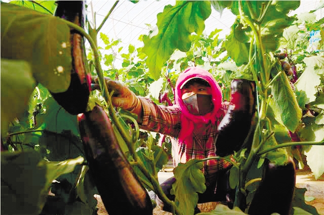 近日,在巴彦淖尔市临河区鲜农设施农业示范园区智能大棚,农民正在查看茄子长势。近年来,该园区积极发展设施农业,形成了“企业承建,农民承租,农企合作,公司统一管理”的生产经营模式,棚菜种植结构不断向智能化、专业化和多样化发展,引领现代农业走标准化、规模化、订单化的高质量发展之路。本报记者 王晓博 摄