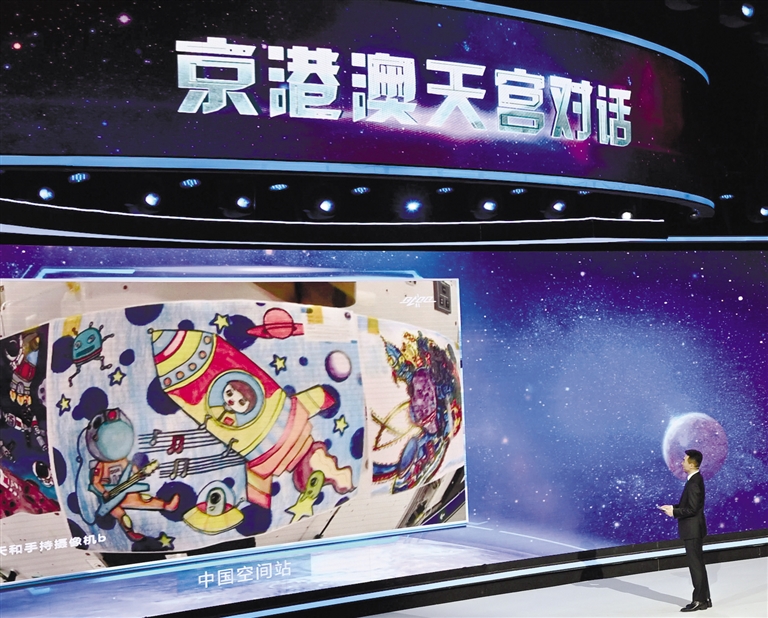 这是中国空间站首次举办天宫画展。在当天举行的“元旦京港澳天宫对话”活动中,神舟十三号航天员乘组对绘画作品进行了现场展示和介绍。