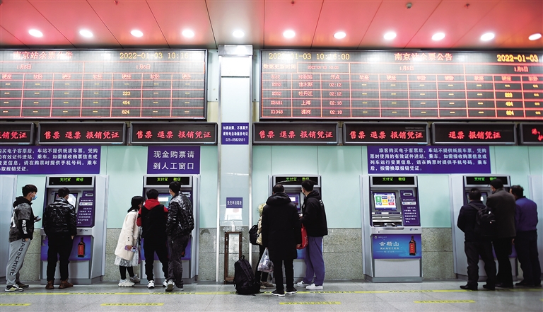 1月3日,旅客在南京火车站售票大厅的自动售票机前排队购买车票。当日,铁路部门开始发售2022年春运火车票。2022年铁路春运自1月17日开始,2月25日结束,共40天,全国铁路预计发送旅客2.8亿人次,同比增长28.5%。
