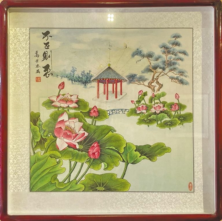 在喀喇沁书画文学院,陈列着一幅特别的画作——《不正则歪》,画的是一幅“荷花池畔,凉亭美景引客来”的夏日景致。其中,凉亭的设计,尤为精巧,当我们正对画作站立,凉亭的4根柱脚笔直而立,当我们侧对画作,凉亭的4根柱脚与圆顶相接的位置则呈现出微微倾斜的角度。