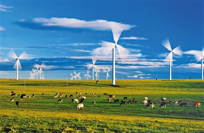 眼下,在锡林浩特市明阳风电场,一座座风电机组如长龙矩阵,高耸入云;一片片风叶迎风转动间,绿色能源正源源不断输出……