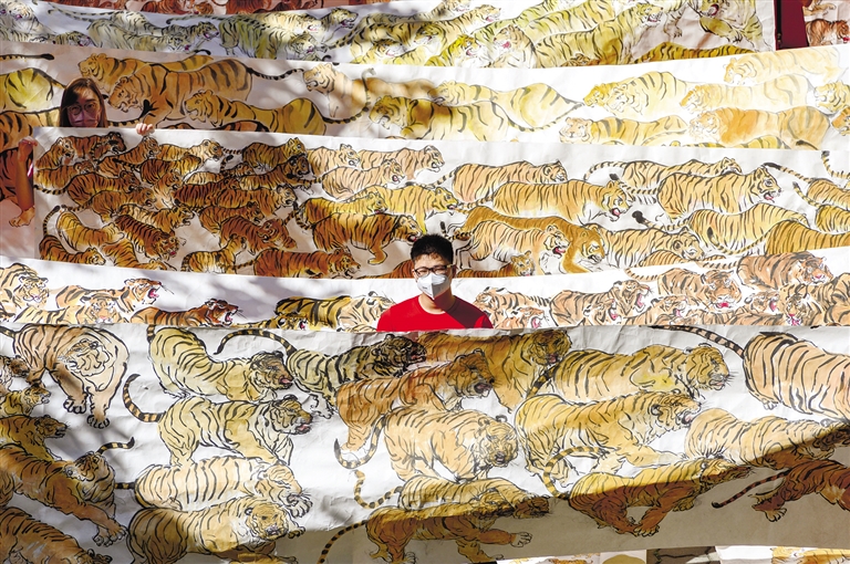 1月16日,在马来西亚雪兰莪州巴生,书画爱好者展示老虎主题的书画作品。当日,当地书画爱好者们展示了包括2022只虎及2022个虎字的书画作品,迎接农历虎年的到来。 新华社发
