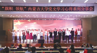 2021年7月1日清晨,内蒙古大学举行了庄严神圣的集体重温入党誓词仪式,全体党员在鲜红的党旗下立下了“请党放心、强国有我”的铮铮誓言。迎着中华人民共和国成立72周年的朝阳,在迎国庆升旗仪式现场,万名内大师生抒写“中华民族一家亲、同心共筑中国梦”的百米长卷,共同抒发爱国情、强国志、报国行。“习近平总书记视察内大时勉励我们,要志存高远、脚踏实地,学好知识,打好基础,增长才干,将来为中华民族伟大复兴贡献自己的智慧和力量。总书记的殷殷嘱托,激励着每一位内大学子立大志、明大德、成大才、担大任,把小我融入大我,努力成为堪当民族复兴重任的时代新人。”活动现场,哲学学院2020级本科生欧阳志说。