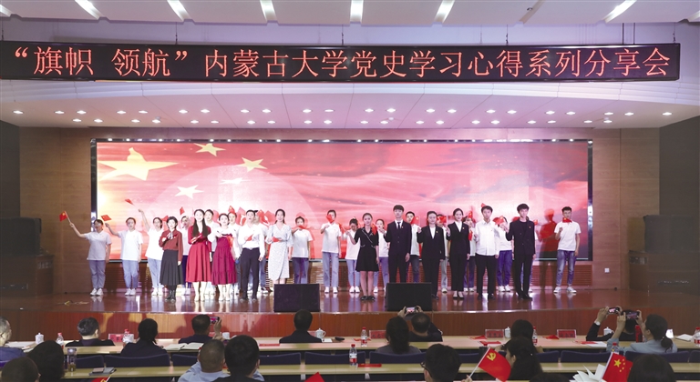 2021年12月10日下午,内蒙古大学学术会议中心8号会议室内气氛热烈,第三期“旗帜·领航”党史学习心得系列分享会在这里举行。由马克思主义学院青年教师和10名学生理论学习轻骑兵走上讲坛,聚焦党的十九届六中全会决议中的几个重大问题,围绕中国特色社会主义为什么“好”的主题,以诗歌朗诵、微课堂、故事分享等形式,用充满热情、饱含真挚的语言讲述了自己心中的党史故事。“分享会前,我们认真查阅资料、精心排练,这些经历使我了解了众多感人至深的中国故事,也加深了我对党的十九届六中全会、对中国特色社会主义的认识,更加坚定了我为中华民族伟大复兴而奋斗的信心。复兴在路上,强国必有我!”马克思主义学院学生赵文萱说。
