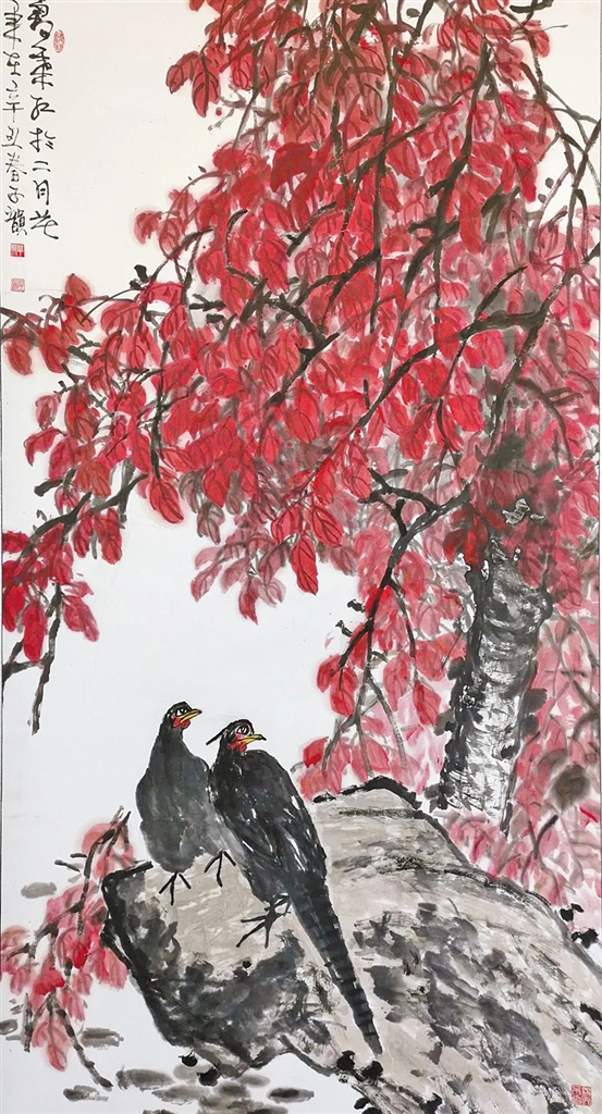 第三,技法手段多样而丰富。本次展览的作品在表现手段上可谓多种多样,这也是当代内蒙古美术教育在具体实践上的表现和反应。具体来说,展览所展示的工笔画作品在技法特点、绘制手段等诸多方面都显得较为丰富,作品面貌也呈现出多元化的趋向。以写意为手段的作品尽管尚待成熟独立的艺术面貌的出现,但也体现了不同表现方法和理念在花鸟画创作中的具体应用。特别值得一提的是,展览中的一些作品在画面上加入了不少现代新材料和与材料相关的新技法,使得多种材料引入到极具传统审美意味的中国花鸟画中,在画面肌理、绘制手法和表现力度上产生了新的效果。我们认为,当代中国画的创作需要在工具、材料上要有新的探讨,现代材料的引进可以为绘画创作和创新提供新的可能和方式。虽然这个探索仍在进行中,但相信会得到中国画家的普遍重视。